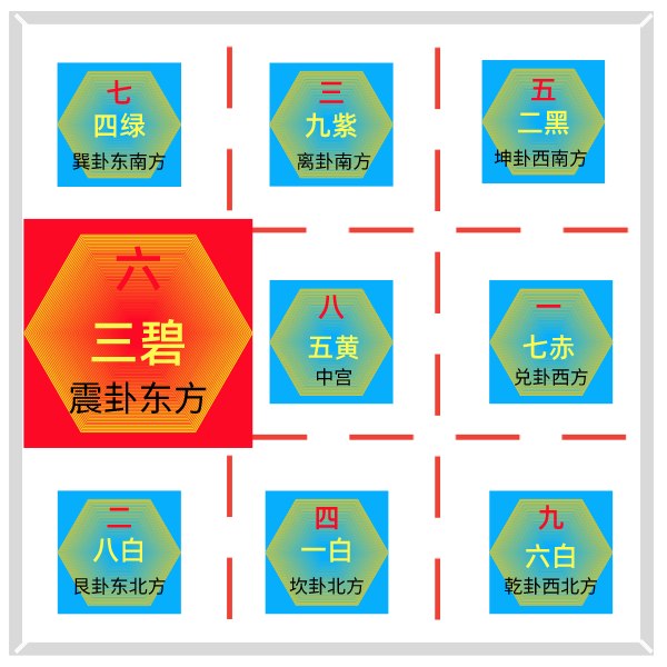 三碧禄存星在现在八运中,是属于死气方,死气方代表的是衰气,也就是说,在2022年正东方这个方位上,九星组合是33六这样的组合,五行是金木相战,三碧代表是非,官非和伤病灾,可以这样来说,复位三碧力量较强大,六白武曲星来相克,激发三碧禄存星凶星,因此在2022年这一年,正东方这个方位是凶多吉少的方位。