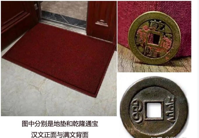 ③、地垫要放在门外,不要放在门内;④、买一个厚款的乾隆通宝,需要一面是汉文,一面满文,买新的仿制款就行,不需要老钱;⑤、把“乾隆通宝”压在地垫下方中央,汉文在下,满文在上,注意摆放时,下方的“乾”字,要朝向门内方向;⑥、用双面胶或透明胶布给钱币固定在地板上,避免长期踩踏导致钱币到处乱窜;⑦、如果用胶布固定,要特别注意不要把铜钱中间的方孔蒙住,要留出透气口。