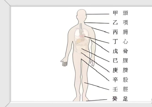 甲为头;乙为肩;丙为额;丁为齿舌;戊己为鼻面;庚为筋;辛为胸;壬为胫;癸为足。