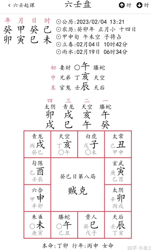 此案例出自某瓣某玄学小组,此网友为女性,87年生,现在在北京工作,老家说起来还都是重庆老乡,所以我也挺愿意帮她分析一下情况。她碰到的情况如下:现在也是在北京有个工作机会,也是个大头兵,但是平台比现在的好点,不确定该不该去?我按正时起课如下,年命丁卯。