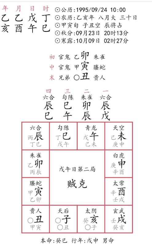 子孙申金可用于代表曹志恒的儿子,今申金乘白虎临日之马星(寅午戌马在申),说明儿子一直在动(工作),三传中末传为丑,丑本为申金之墓库,但丑为日柱干支之空亡,故不能墓金。唯到了丑月填实之际,方能墓金。又儿子年命辰土坐巳火之上贪巳火之生,初、中传卯木、寅木俱来生助火势,唯末传丑土能破辰,使辰彻底脱离巳火之生(即儿子完全脱离工作单位),但三传中丑土空亡,必待丑月填实后,末传丑土气旺可一举破辰,使辰完全脱离巳火之生,又巳丑半拱金局,可使巳火之气改变流向。