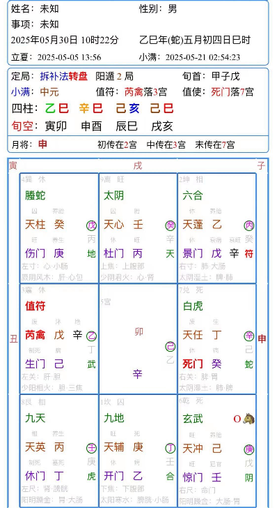 点悟:学生思路没问题根据主客动静,找到了各种定位!其实这是一个特殊情况,具有很强代表性不错!在胎产占测应用上,坤可以代表母室,六合也可以代表母室,这两个信息都出现在坤宫,又妻子六亲宫在坎,坤宫先天宫又在坎具有连锁性,又坎地盘干乙,出现在了坤宫天盘乙!这是一个非常特殊重合克应定律!所以我们确定母室在坤上天蓬阳星乙阴干,则看景门阴门女孩!大家学的是这行重合连锁克应定律!