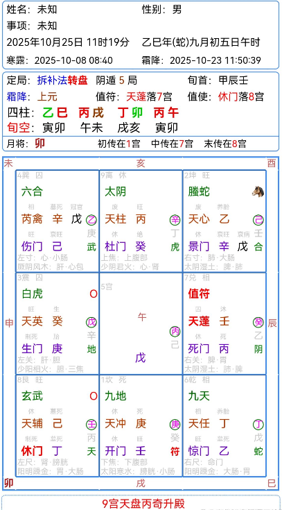 丙落离9宫三奇升殿!天柱为临星戌月不旺则不可以出行,待到亥月天柱星旺即可出发!方位面向南方!可以念丙奇咒9遍!这就是奇门遁甲运筹最基本!
