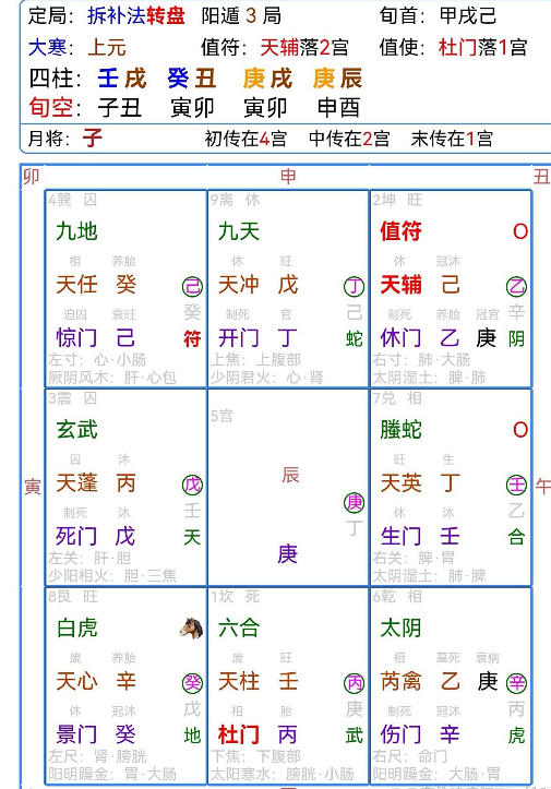 丙为财宫得丙加戊飞鸟跌穴大利财运,命克3宫卯年大利财运,投资有利,但戊击刑需破财,可通过化宝符合戊击刑才可以!生门得三奇丁升殿合格7宫和命宫6宫比和。3宫冲7宫。必须把7宫生门之财补齐。后天为数量,7万7千7百7十7两,丁为文书上表升殿,