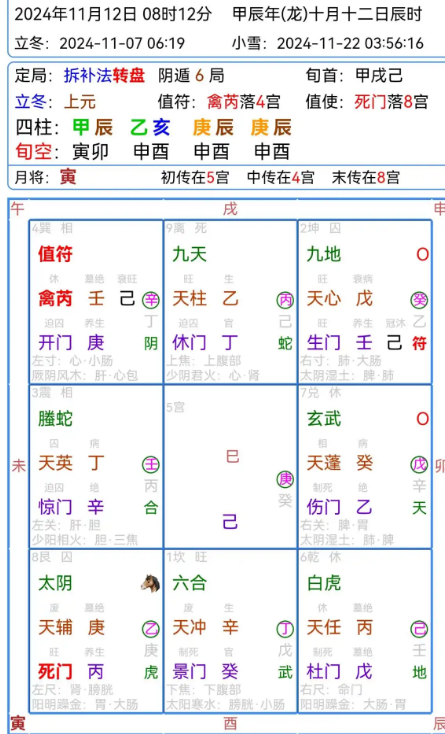 2:很明显我方直符宫也就是4巽宫,宫内壬加庚,遇到壬击刑不是很好,庚阻隔,壬天牢是非,遇到庚和极刑会有破碎钱会有损要债损耗,又有开门说明可以采取起诉法律!暗干丁利用文书合同,保留暗自电话文案证据!