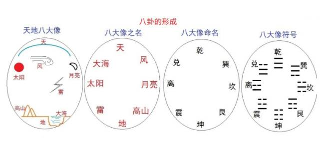八大像又被古代人取了名字,天(乾)、地(坤)、震(雷)、巽(风)、坎(月亮)、离(太阳)、艮(高山)、兑(大海)。