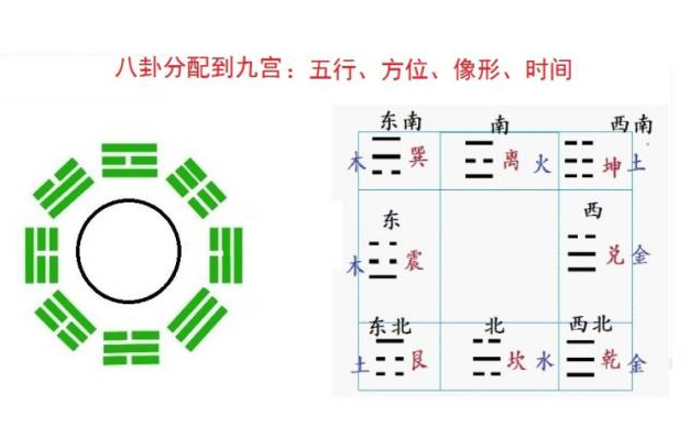3:下图则说明八卦配入九宫当中的图像,八卦本身具备五行、方位、时空、空间等。
