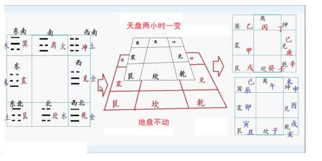 4:下图是将九宫八卦一分为二,天盘九宫和地盘九宫是奇门遁甲的大体结构。天盘两小时动一次,地盘不动。为了区别天盘和地盘,天盘分别放入了10天干即:甲乙丙丁戊己庚辛壬癸。