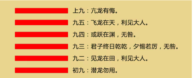 卦是从下往上看的,乾卦六爻逐一解开来看,给我们的密码无非是六个字而已:潜、现、惕、跃、飞、亢。根据爻辞的指示,我们把六爻用龙的形象来对应分别是:潜龙、现龙、惕龙、跃龙、飞龙、亢龙。