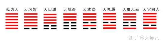 每卦的上卦都是乾卦,每个卦的下卦都是依照先天八卦的数字次序:乾1、兑2、离3、震4、巽5、坎6、艮7、坤8配合的,两卦相重就形成了乾卦、履卦、同人卦、无妄卦、姤卦、讼卦、遁卦、否卦这8个卦。