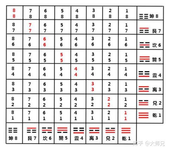 你是不是发现像六十卦的数字图像背乘法表一样,像是把九九乘法表颠倒过来排序一样。
