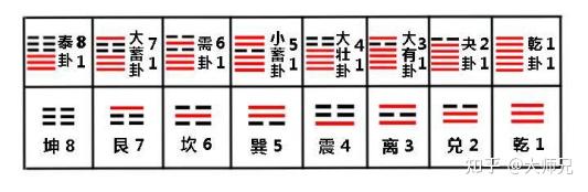 我们发现每卦的下卦都是乾卦,每个卦的上卦都是依照先天八卦的数字次序:乾1、兑2、离3、震4、巽5、坎6、艮7、坤8配合的,两卦相重就形成了乾卦、夬卦、大有卦、大壮卦、小蓄卦、需卦、大蓄、泰卦这8个卦。