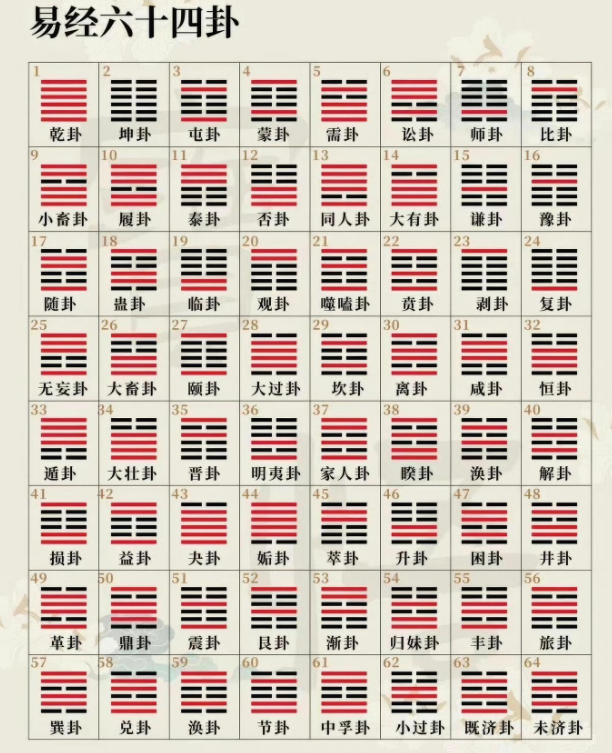 六十四卦,记载于《易经》,每一卦的图像均由两个八卦上下组合而成,每一卦各有六个爻。南宋朱熹说,先画八卦于内,后画八卦于外,以旋相加,而为六十四卦。