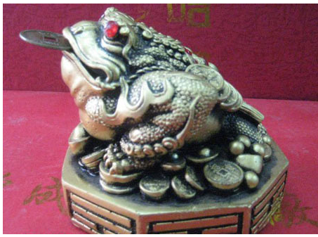 与一般的蟾蜍(又名癞蛤蟆)四条腿不同,这蟾蜍为刘海仙人(注:刘海仙人,本名操,字符英,号海蟾子,五代后梁陜西人,生卒年不详。曾事燕王刘守光为相,后为吕纯阳弟子,创道教南宗,与北宗王喜对抗。注:吕纯阳为八仙其中一位仙人,俗称吕祖)座下的神兽,能增强民间居民的财运,所以便属于旺财的神兽。摆放这一只神兽旺财要有技巧的,就是她的嘴所吐出铜钱。