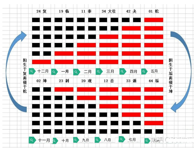其实,64卦每一卦都有6个位置,而不是仅有6个爻。在位的6个爻称为显爻,显于位也;不在位的6个爻称为隐爻,隐于野而已。在64卦中,最原始的卦就是十二消息卦,其它卦都是由十二消息卦变化而来的。而十二消息卦最大的特点就是12个爻(其中6个阳爻和6个阴爻)按照天地之道,阴阳不交不杂,顺序而不断阴阳消息。故十二消息卦下面还有3个待息的爻,而上面还有3个已消的爻,称为隐爻。依据十二消息卦12个爻阴阳不交不杂的规律,每个隐爻的阴阳属性是很好判断的。在十二消息卦的卦位上,阴消则阳息,阳消则阴息,从而形成十二消息卦循环往复,周而复始的运动变化体系。这是一个自然的、能反映四季轮回和昼夜交替变化规律的运动体系。十二消息卦有显爻和隐爻,这个规律我们接受了,那显爻和隐爻一共有12个,而且是6个阳爻和6个阴爻。也许有人会问,何以见得呢?很简单,在十二消息卦中,《乾卦》是纯阳卦,阳爻最多,故阳爻为6个;而《坤卦》是纯阴卦,阴爻最多,故阴爻也为6个。