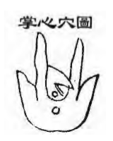 上图为仙宫,共七穴,四穴吉,三穴凶。《圆机歌》云“七个建星三个凶,左右仙宫一样同”是也。 球穴在大指、点塩指中,似虎口穴也,吉。大富穴在大指第一节,吉穴也。红旗穴在第二指一节,吉穴也。曲池穴在第二指二节,吉穴也。绝穴在大指表头,主绝,凶。扫荡穴上无顶而下散,凶穴也。燥火穴上亦 无顶而下尖,凶穴也。