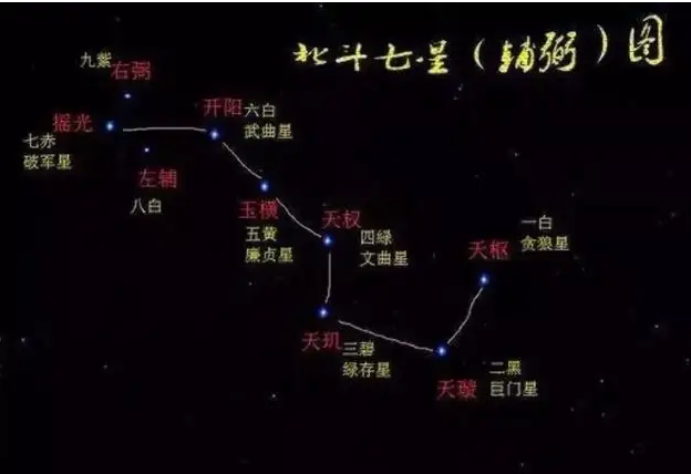 前四颗为魁,勺柄为斗。斗柄指东为春季,斗柄指南为夏季,斗柄指西为秋季,斗柄指北为冬季。