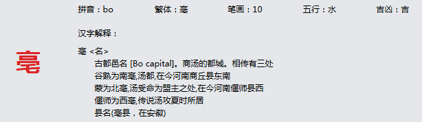 亳 拼音:bo 繁体:亳 笔画:10 五行:水 吉凶:吉