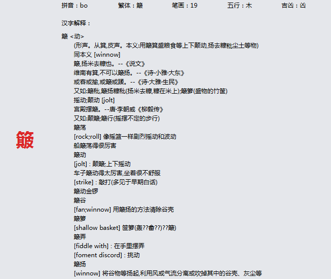 簸 拼音:bo 繁体:簸 笔画:19 五行:木 吉凶:凶