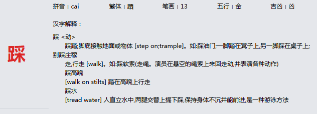 踩 拼音:cai 繁体:跴 笔画:13 五行:金 吉凶:凶