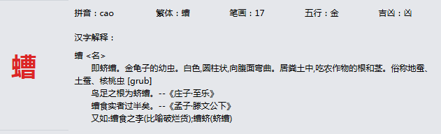 螬 拼音:cao 繁体:螬 笔画:17 五行:金 吉凶:凶
