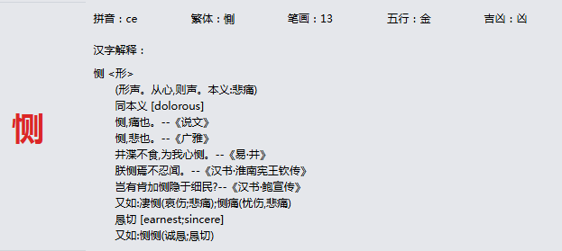 恻 拼音:ce 繁体:惻 笔画:13 五行:金 吉凶:凶