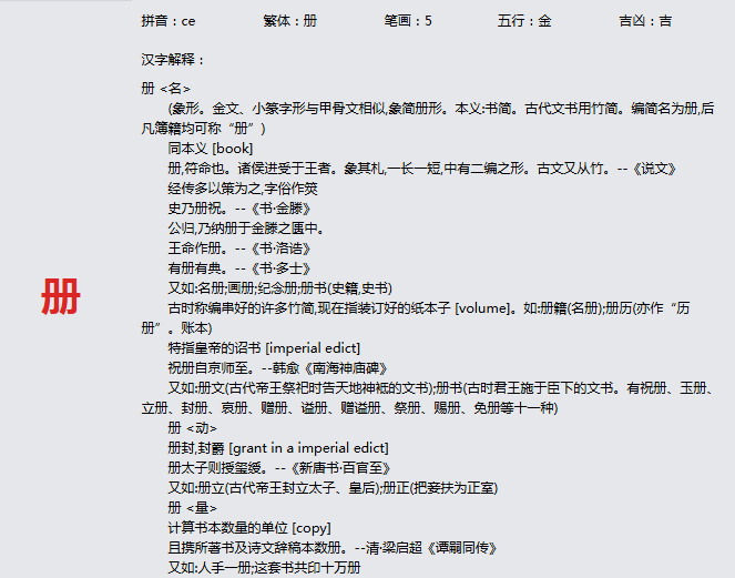册 拼音:ce 繁体:册 笔画:5 五行:金 吉凶:吉