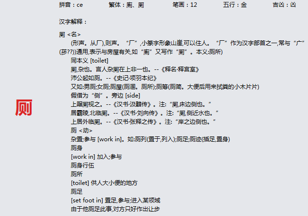 厕 拼音:ce 繁体:廁、厠 笔画:12 五行:金 吉凶:凶