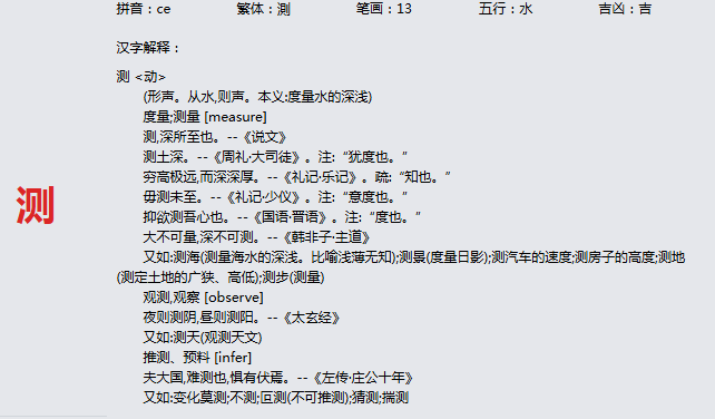 测 拼音:ce 繁体:測 笔画:13 五行:水 吉凶:吉