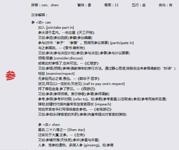 参 拼音:cen、shen 繁体:參 笔画:11 五行:金 吉凶:吉