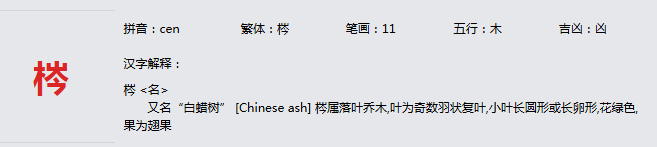 梣 拼音:cen 繁体:梣 笔画:11 五行:木 吉凶:凶