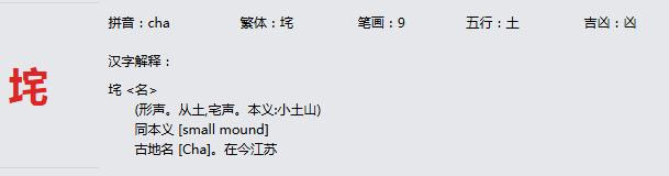 垞 拼音:cha 繁体:垞 笔画:9 五行:土 吉凶:凶