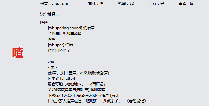 喳 拼音:cha、zha 繁体:喳 笔画:12 五行:金 吉凶:凶