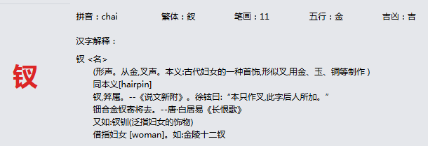 钗 拼音:chai 繁体:釵 笔画:11 五行:金 吉凶:吉