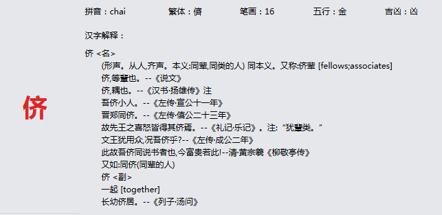 侪 拼音:chai 繁体:儕 笔画:16 五行:金 吉凶:凶