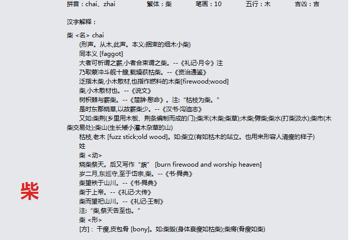 柴 拼音:chai、zhai 繁体:柴 笔画:10 五行:木 吉凶:吉