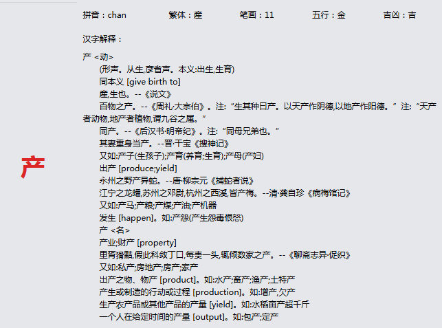 产 拼音:chan 繁体:産 笔画:11 五行:金 吉凶:吉