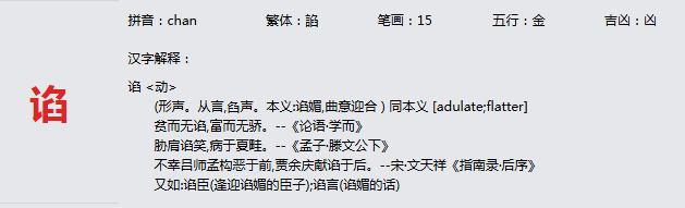 谄 拼音:chan 繁体:諂 笔画:15 五行:金 吉凶:凶
