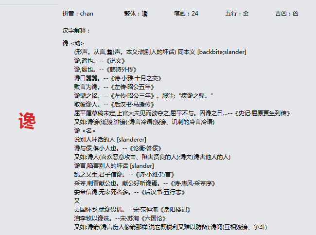 谗 拼音:chan 繁体:讒 笔画:24 五行:金 吉凶:凶