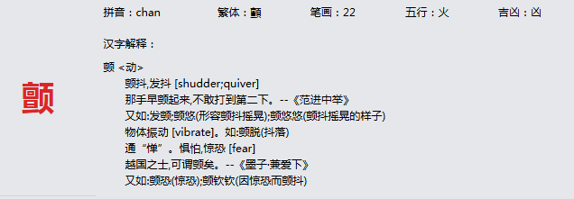 颤 拼音:chan 繁体:顫 笔画:22 五行:火 吉凶:凶