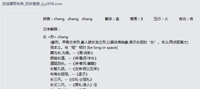 长 拼音:chang、zhang、zhang 繁体:長 笔画:8 五行:火 吉凶:吉