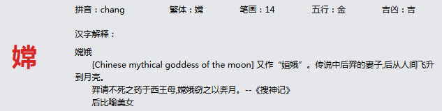嫦 拼音:chang 繁体:嫦 笔画:14 五行:金 吉凶:吉