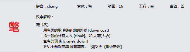 氅 拼音:chang 繁体:氅 笔画:16 五行:金 吉凶:凶