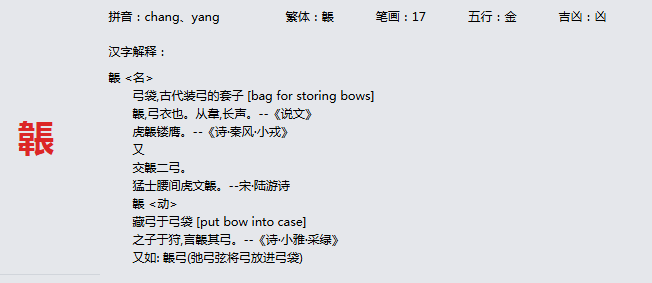 韔 拼音:chang、yang 繁体:韔 笔画:17 五行:金 吉凶:凶