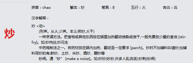 炒 拼音:chao 繁体:炒 笔画:8 五行:火 吉凶:凶