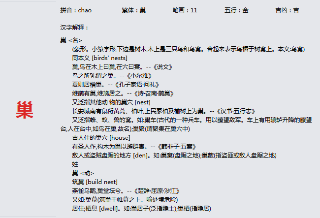 巢 拼音:chao 繁体:巢 笔画:11 五行:金 吉凶:吉