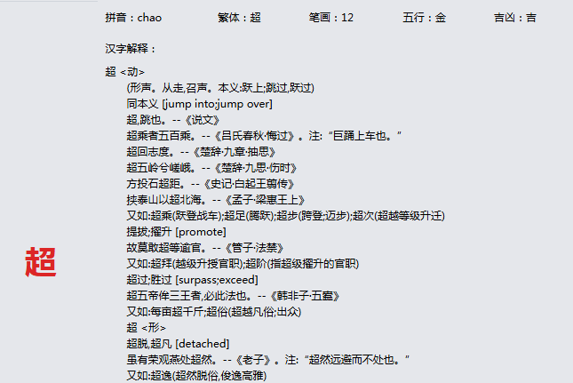 超 拼音:chao 繁体:超 笔画:12 五行:金 吉凶:吉