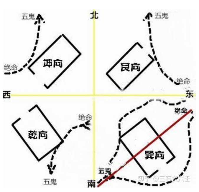 “绝命通鬼路”是八宅风水和阳宅三要风水流派的知识点,指的“绝命位”和“五鬼位”有的八宅流派是用房屋的坐山起伏位,排“伏生五延六祸天绝”看看各在什么卦位;有的八宅流派——确切地说是“阳宅三要”流派,是用房屋的向首起伏位,排“伏生五延六祸天绝”。找出“绝命”在什么卦位,“五鬼”在什么卦位,房屋的这两个卦位有路连在一起,就会造成“绝命通鬼路”,住在这个房子的人发生车祸等事情发生!