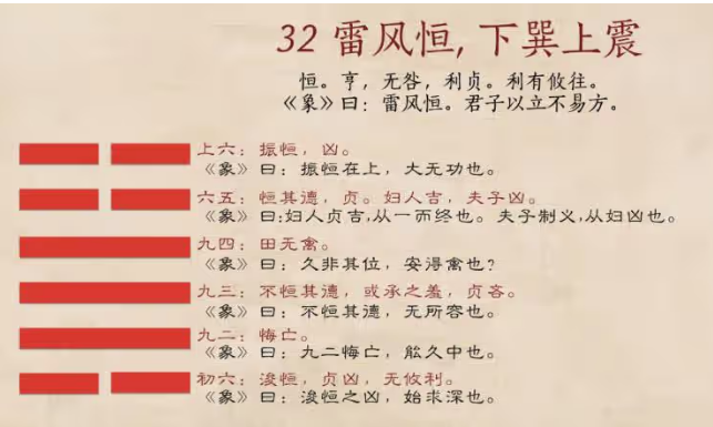 恒(héng)卦是《易经》六十四卦第32卦。雷风恒(恒卦)恒心有成。代号是3:4。3:4卦的主卦是3卦巽卦,卦象是风,阳数是3;客卦是4卦震卦,卦象是雷,阳数是4。恒:亨,无咎,利贞。利有攸往。 恒卦:通达,没有过失。有所往则有利。