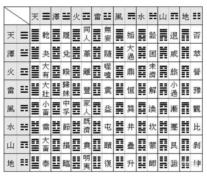 《易》中的八经卦﹐两两重复排列为六十四卦。卦名是:乾﹑坤﹑屯﹑蒙﹑需﹑讼﹑师﹑比﹑小畜﹑履﹑泰﹑否﹑同人﹑大有﹑谦﹑豫﹑随﹑蛊﹑临﹑观﹑噬嗑﹑贲﹑剥﹑复﹑无妄﹑大畜﹑颐﹑大过﹑坎﹑离﹑咸﹑恒﹑遁﹑大壮﹑晋﹑明夷﹑家人﹑睽﹑蹇﹑解﹑损﹑益﹑夬﹑姤﹑萃﹑升﹑困﹑井﹑革﹑鼎﹑震﹑艮﹑渐﹑归妹﹑丰﹑旅﹑巽﹑兑﹑涣﹑节﹑中孚﹑小过﹑ 既济﹑未济。